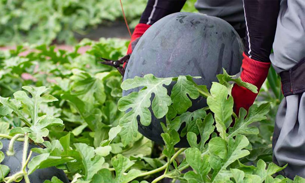でんすけすいかは、雪解けが始まる3月下旬から栽培が始まります。大きくて糖度が高く、実がぎっしりつまったすいかに育てるため、一株から一個だけを育てる「一果採り」を採用。重みによる偏りや品質の低下を防ぎ、まんべんなく日光を充てるための「玉返し」という作業を繰り返しながら、6月の初出荷を迎えます。7月下旬までという非常に短い栽培期間であり、高い栽培技術が求められます。