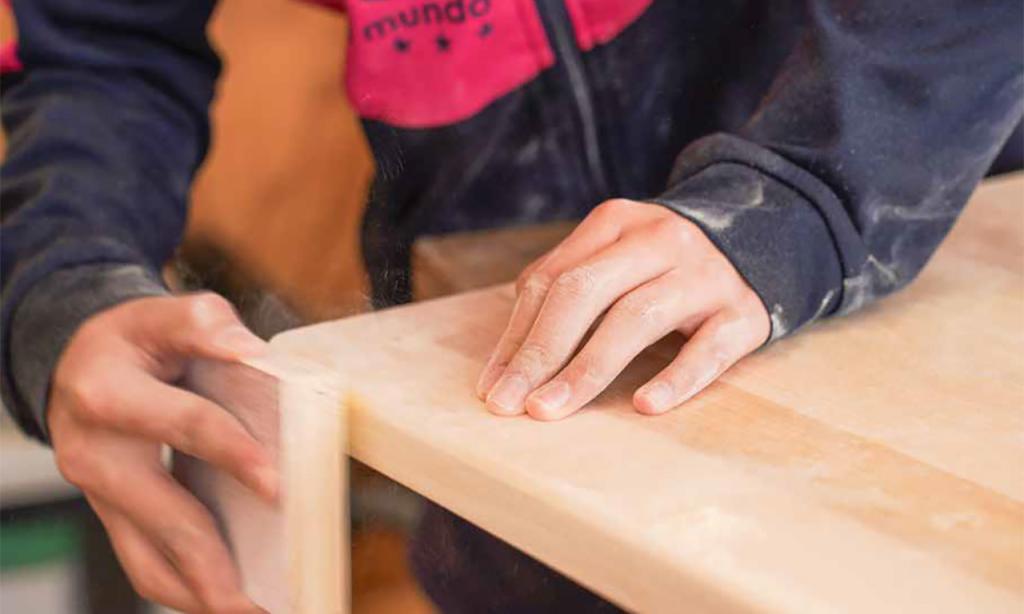 町内の小学6年生は、中学校入学を間近に控えた2月頃、「くるみなの木遊館」に赴き、机製作を始めます。生徒たちが製作するのは、机の天板部分。町産のカバ材を使用し、「くるみなの木遊館」で加工した天板と、町内の鉄工所「世良鉄工株式会社」が製作した物入れを組み上げていきます。木工をするのは初めてという子どもがほとんど。面取りのためのやすり掛けや、ボンドによるパーツ取り付けなどに四苦八苦しながら製作していきます。完成後、机には〝自分専用の証〟として、自身の名前のプレートが取り付けられます。